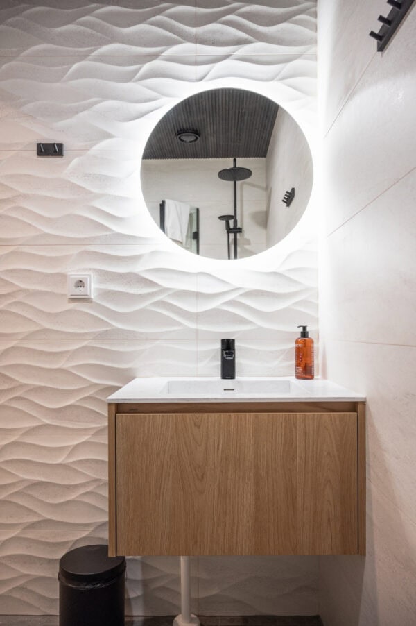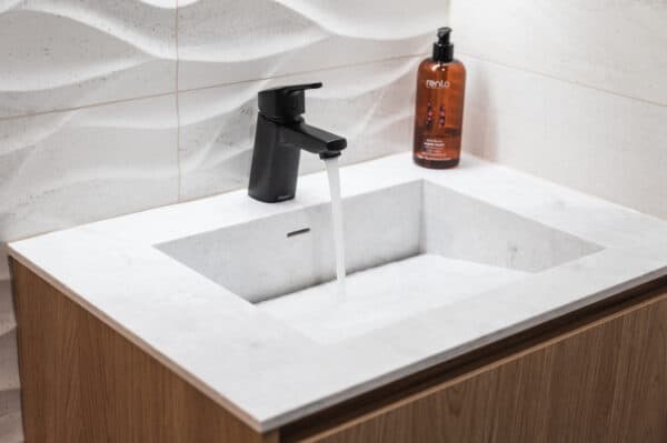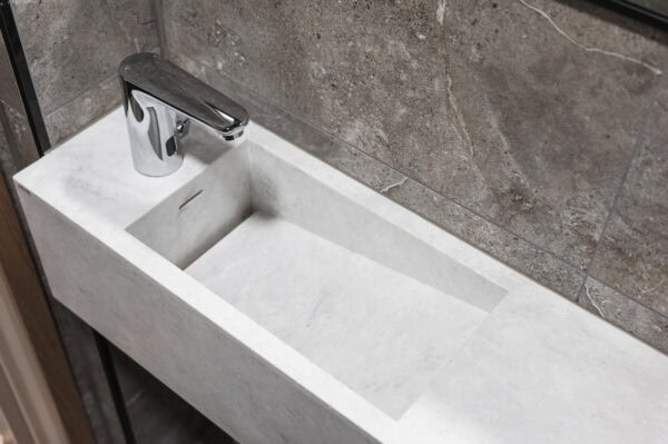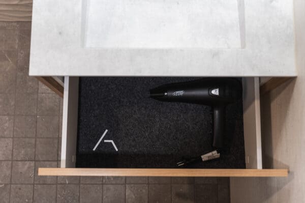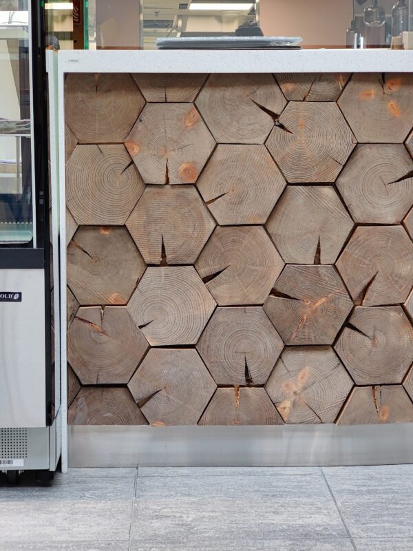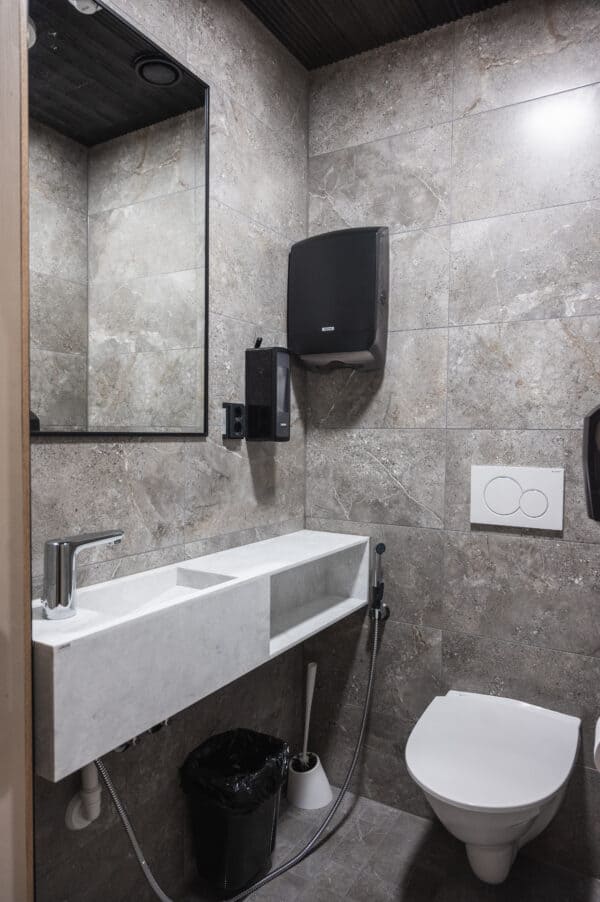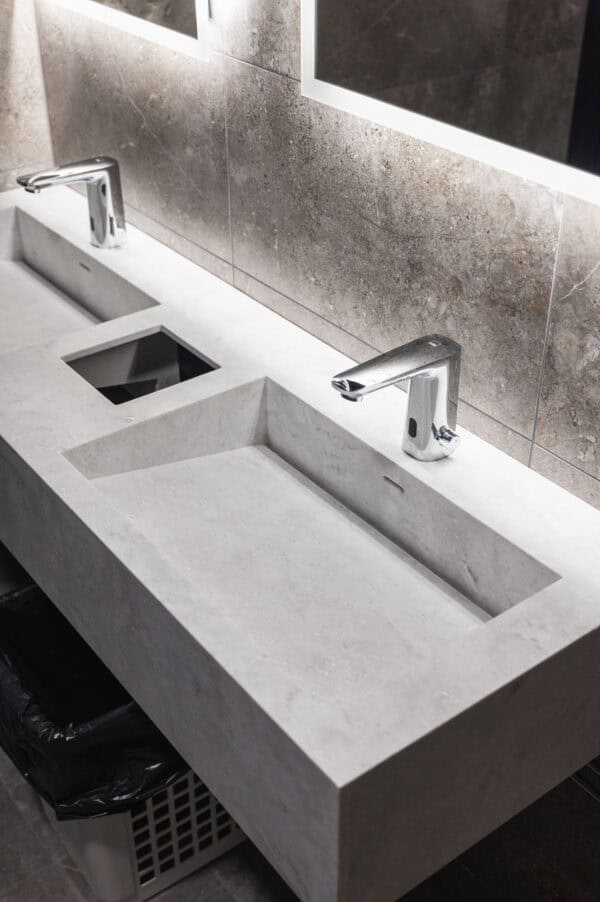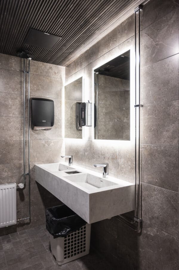 Toteutimme Santa’s Resort & Spa Hotel Sani yleellisen ravintolatiskin sekä WC-kalusteet.