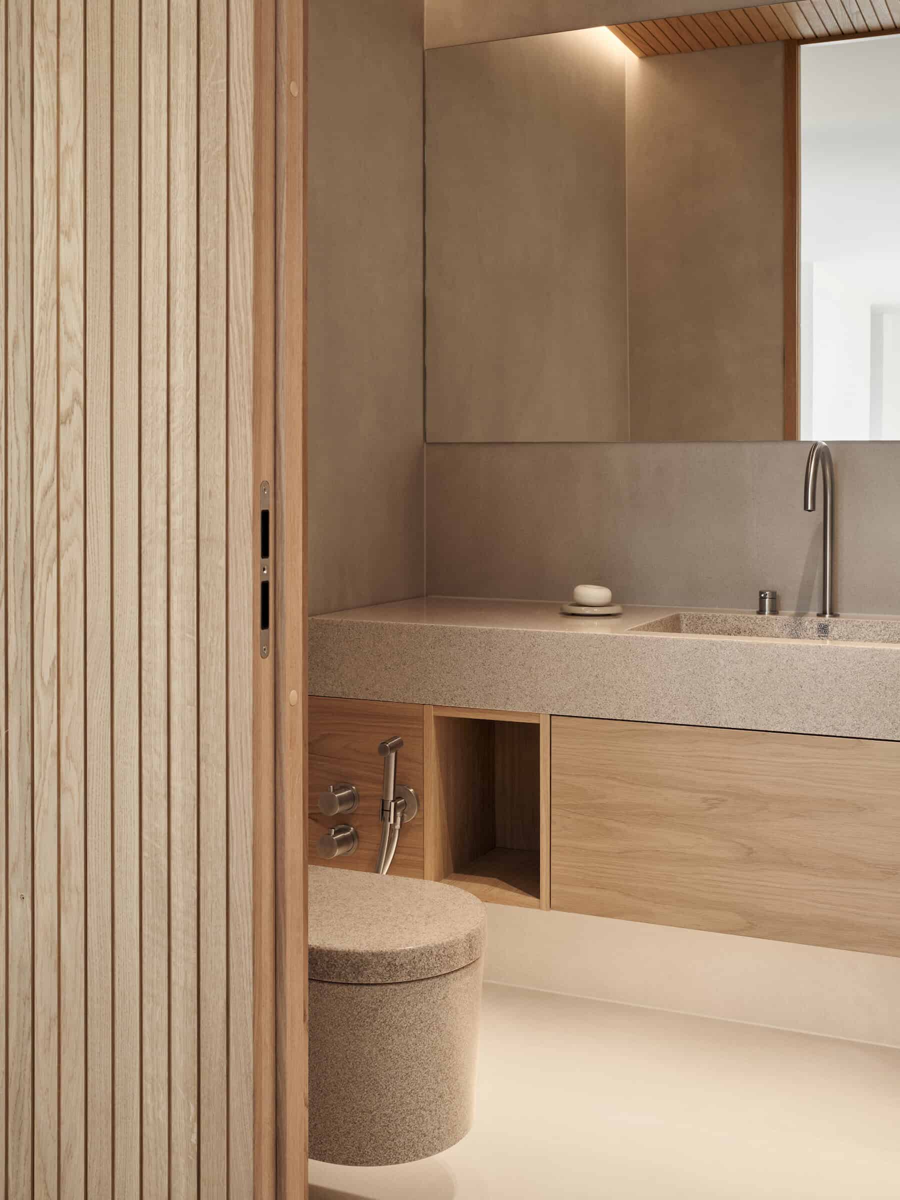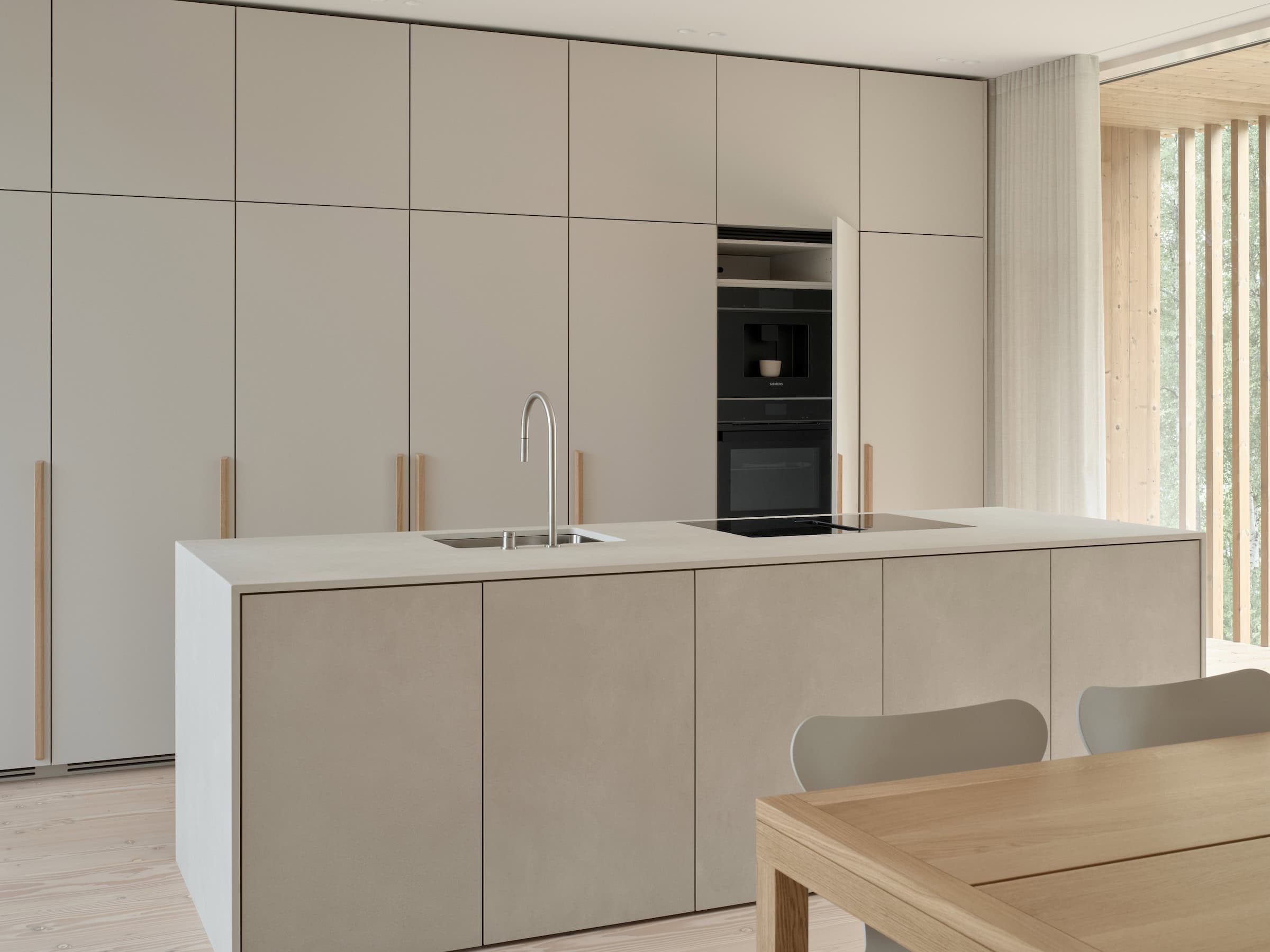 Keittiön sydämenä on Laminam-keramiikalla verhoiltu saareke. Se on jykevä ja viimeistelty, mutta samalla hillitty osa kokonaisuutta. Saareke ei kilpaile huomiosta, vaan antaa pääroolin ikkunoista avautuvalle merimaisemalle ja taustalla siintävälle Oulun keskustalle.