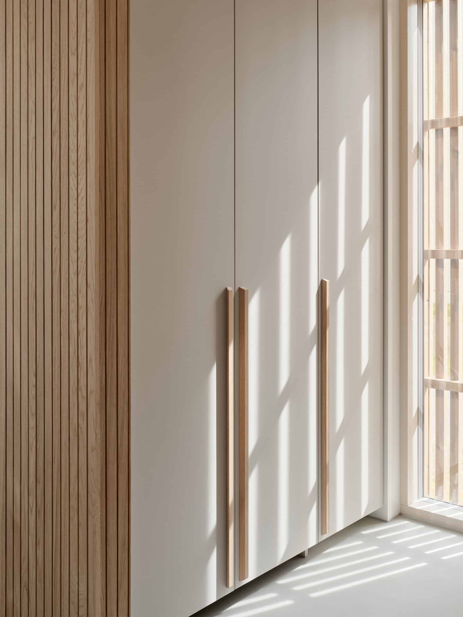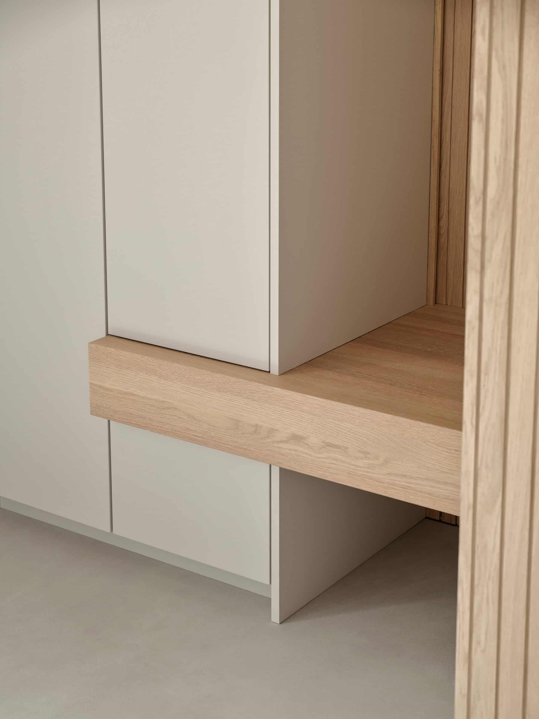 Villa Prykässä kalusteet suunniteltiin jatkamaan talon arkkitehtuuria. Sekä ovien että runkojen sävyt valittiin talon sisäpintojen perusteella, jotta kokonaisuus olisi yhtenäinen ja rauhallinen. Rungot valmistettiin suomalaisesta Koskisen Zero -kalustelevystä. Tämä on kotimaisuuden lisäksi ekologinen valinta.