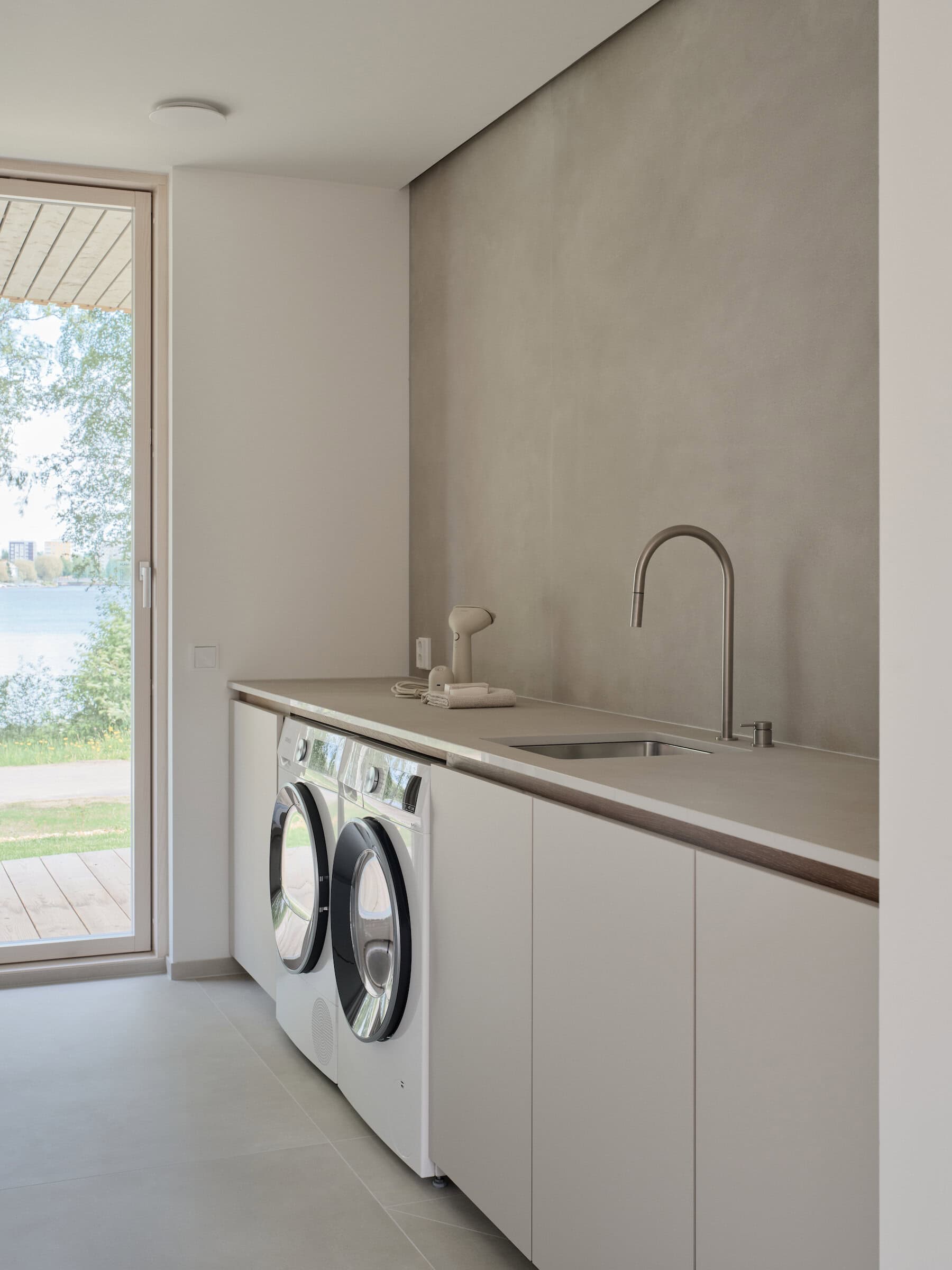 Siemensin kodinkoneet integroitiin osaksi kalustekokonaisuutta niin, että keittiö säilyy rauhallisena ja yhtenäisenä. Uuni ja kahvikone piiloutuvat kalusteovien taakse, kun tila halutaan täysin harmoniseksi.