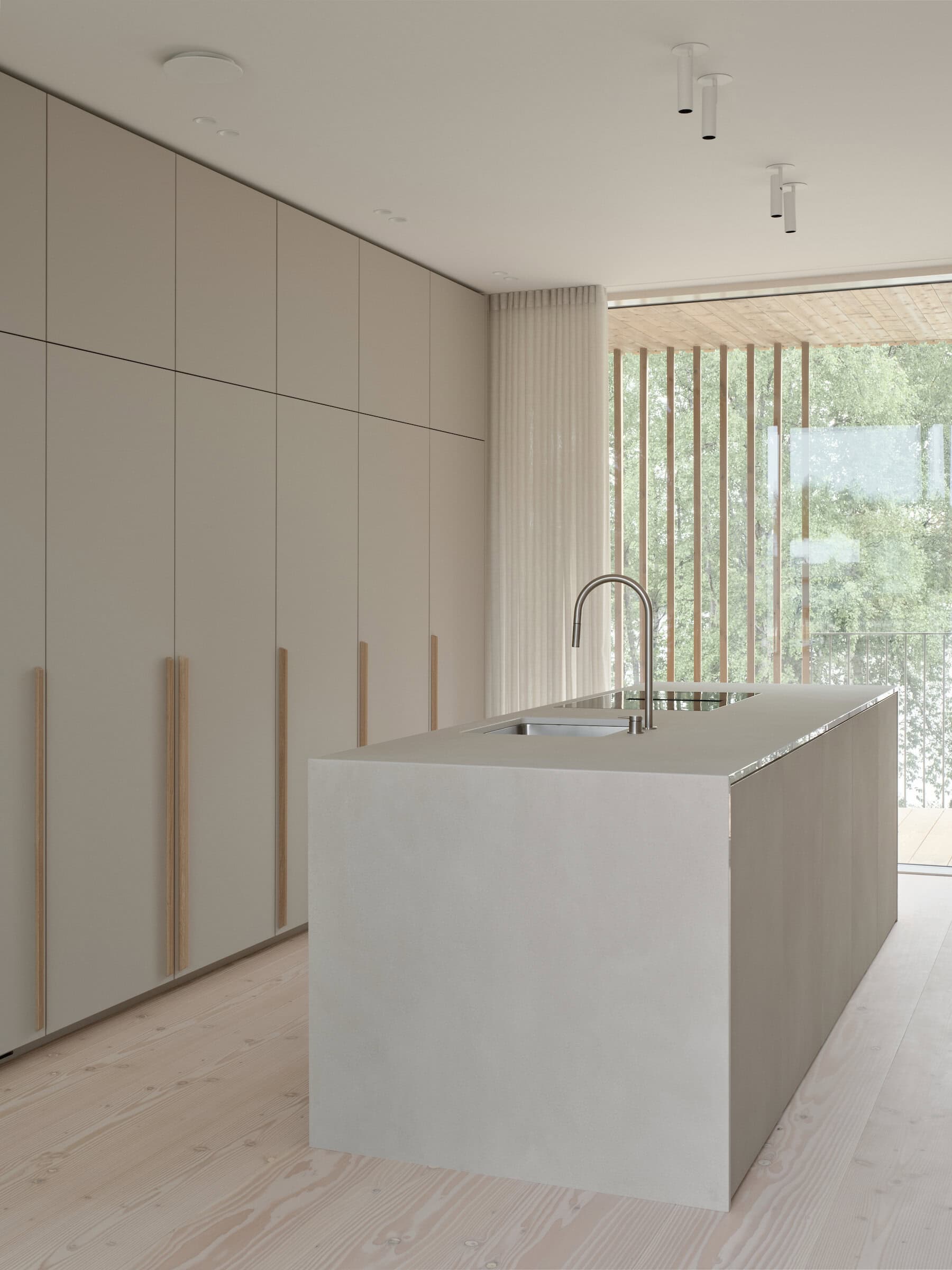 Keittiön sydämenä on Laminam-keramiikalla verhoiltu saareke. Se on jykevä ja viimeistelty, mutta samalla hillitty osa kokonaisuutta. Saareke ei kilpaile huomiosta, vaan antaa pääroolin ikkunoista avautuvalle merimaisemalle ja taustalla siintävälle Oulun keskustalle.