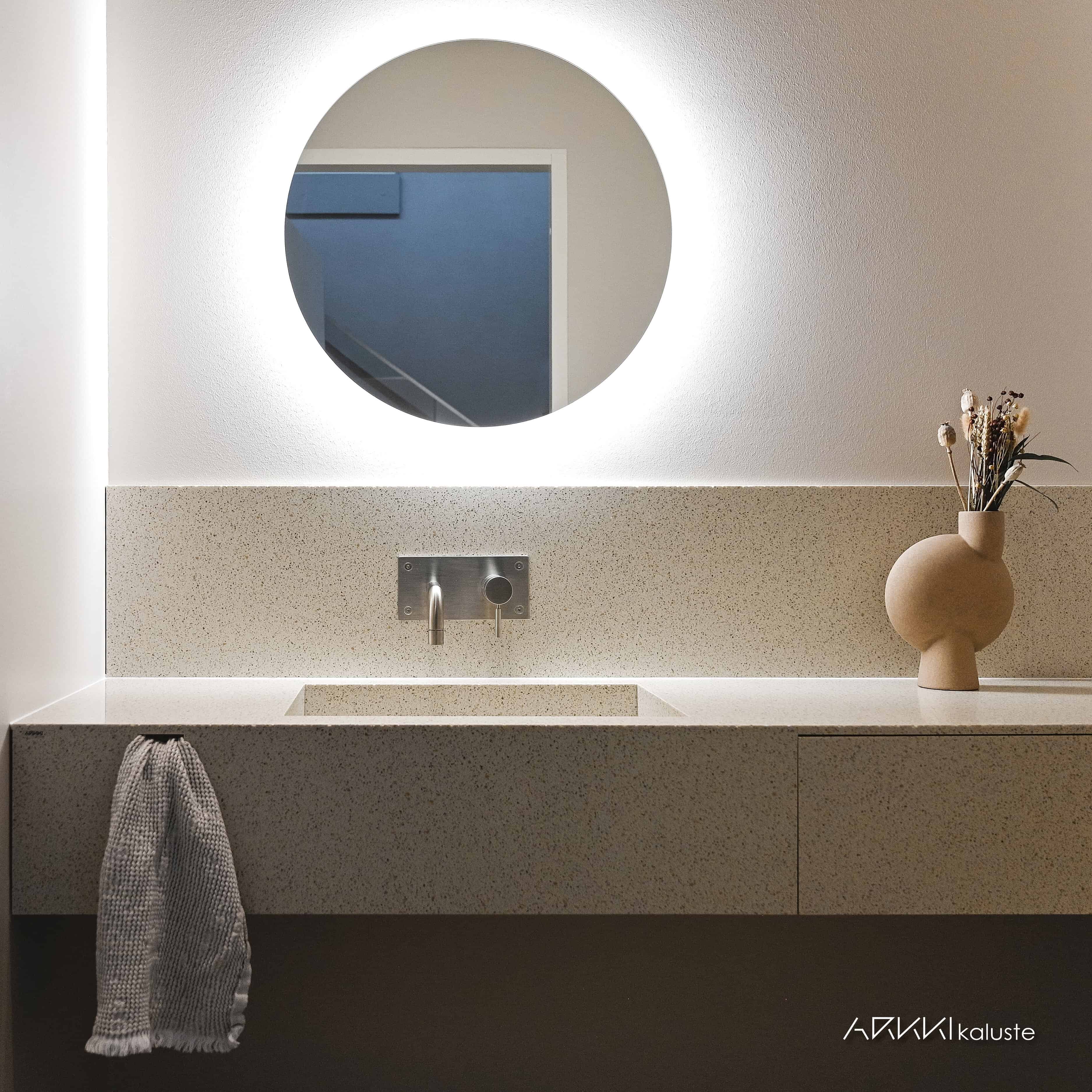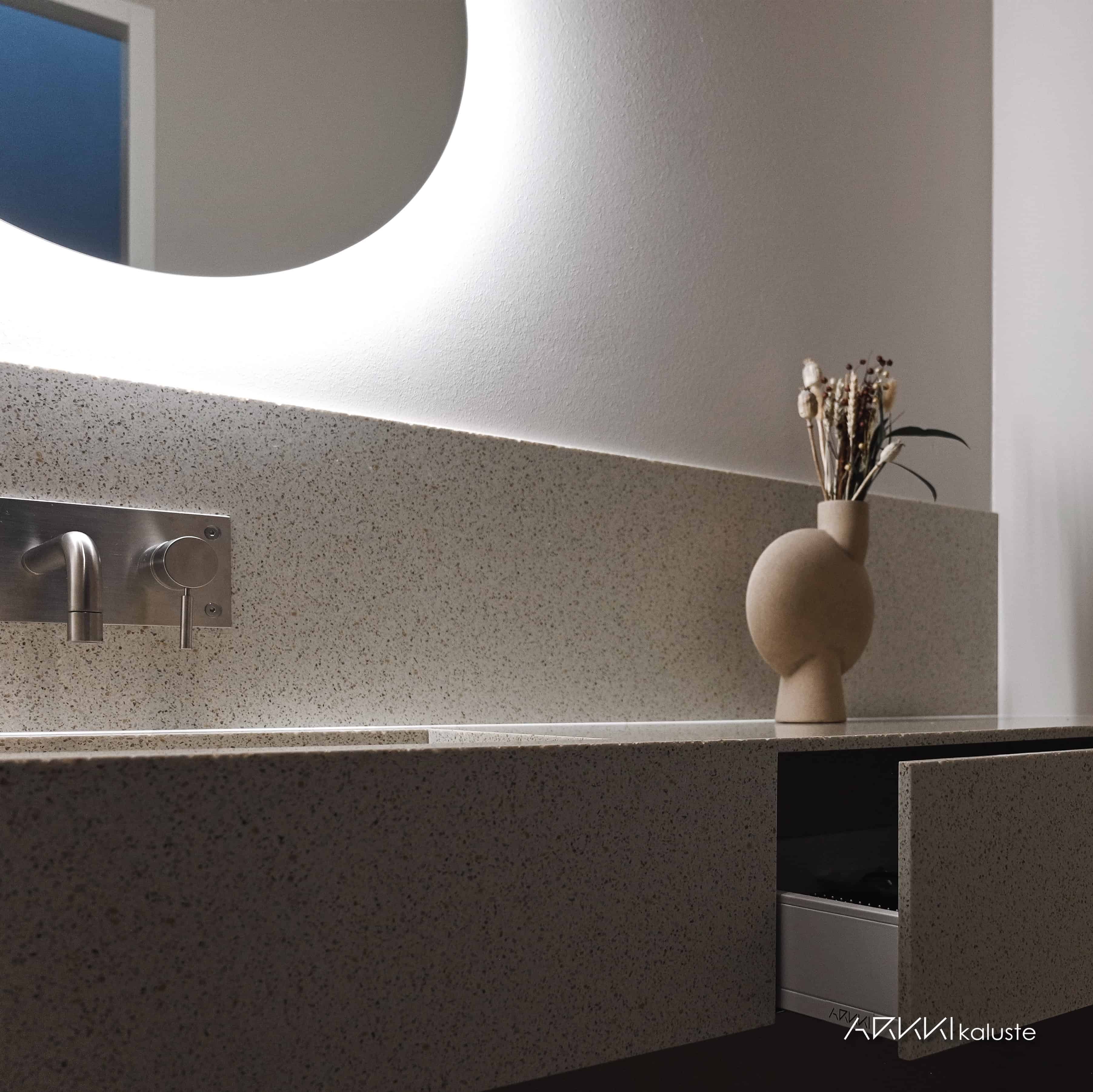 Kuutio Allastasossa yhdistyvät esteettisyys ja käytännöllisyys. Lumoava Kuutio luo kylpyhuoneeseen rauhoittavan, seesteisen tunnelman. Vesi virtaa kauniisti pohjalevyn alle piilottaen veden kulkuaukon. Saumaton, virtaava muotoilu ja ARKKIkomposiitti -materiaali tekevät kalusteesta hygieenisen, helppohoitoisen ja kestävän tunnelmantuojan.